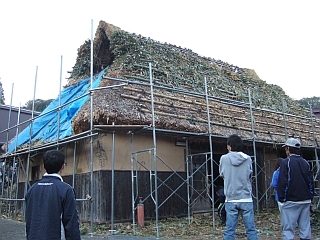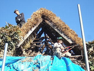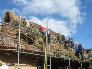 自分たちが刈った茅を使って屋根の修復作業を行い,