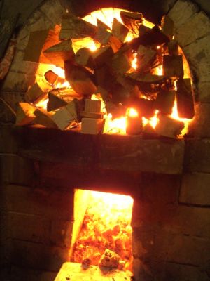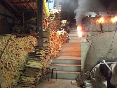 火の番の仕事は,窯の焚き入れ口から薪を供給することですが,