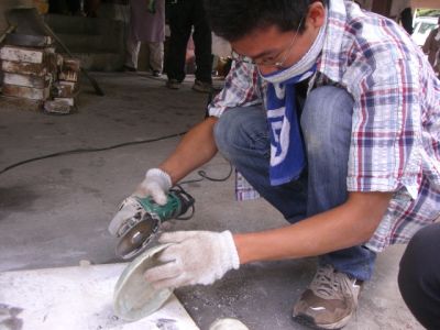 研磨機を使って作品の仕上げ作業を行います。