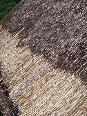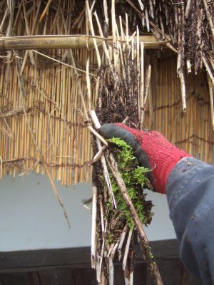 屋根に使われている茅の分解が進み,既に土に近い状態になっています。