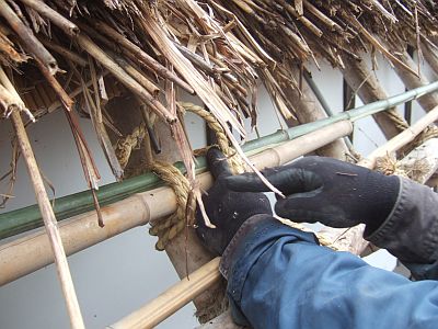 先ほど交換した竹に新しい茅を固定し終わったら,