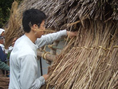 お昼の休憩を挟み,午後からは茅を使った休憩所作りです。
